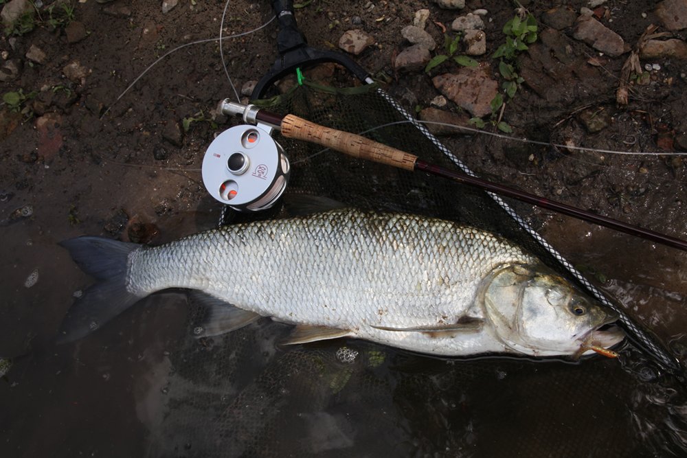 Das Wasser in der Waal – die Abtrennung des Rheins, kurz nach der niederländischen Grenze – ist noch sehr niedrig, aber die Rapfen jagen schon aktiv auf Brutfische. An einer Stelle mit schneller Strömung, probierte ich heute Nachmittag einige Streamer. Der erste Wurf ergab direkt einen Schlag auf die Fliege, ein hoffnungsvoller Beginn. Da das Ufer hinter mir sehr hoch war, benutzte ich eine 9’6″ lange Rute für eine 6er Schnur. Am Ende der AIRFLO Ridge Clear Floating Schnur, knüpfte ich ein 9 Fuß langes Vorfach und eine Spitze aus AIRFLO 3X Fluorocarbon. In dem Moment wo ich ziemlich statisch eine Christiaans Tuna Fly fischte (ein Muster mit einem Schwanz aus Arctic Fox und ein Körper bedeckt mit Epoxy), wurde diese voll attackiert. Ich konnte den Fisch direkt mit der Rolle drillen, und bekam somit keine Probleme mit eventuelle lose Schnur. Der schwere Fisch nutzte die Strömung voll aus, aber eine tief durchgebogene Fliegenrute, wusste sie letztenendes Richtung Kescher zu dirigieren. Das Maßband zeigte 82cm an, ein schöner Fang! Schnell ein Paar Bilder und schon verschwand der Rapfen wieder in die Tiefe. Nach diesem Fanf war es kurz ruhig, aber es dauerte nicht lange, bevor links und recht wieder Fische anfingen zu jagen. Wilde Turbulenzen, große Schwänze die durch die Gewässerfläche brechen… ich bringe meine Fliegenschnur schon wieder auf Länge!