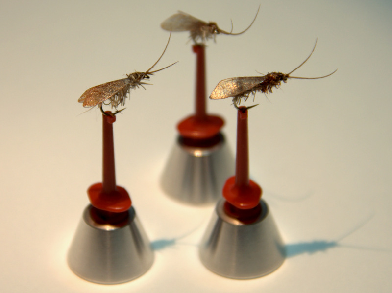 Deswegen möchten wir in unserem Blog eine Fliege vorstellen, die in unserer Fliegenbox einen prominenten Platz einnimmt. Es ist die Slowenische Sedge. Das ist keineswegs eine neue Fliege, aber wohl eine die sehr gut fängt und das verdankt diese Fliege nicht zuletzt ihren hervorragenden Schwimmeigenschaften. Der Körper dieser sehr realistischen Sedge wird mit Rehhaar gedubt. Das ist zwar nicht einfach, aber mit etwas Übung wird jeder Binder es schaffen. Ein Büschel Rehhaar wird zwischen Daumen und Zeigefinger zu einem Kügelchen gerollt. Die sich in einander hakenden Härchen werden auf dem Bindefaden angebracht und ein Körper wird gebunden. Als Flügel kann man selber verschiedene Federn vom Fasan, Ente oder sonstiges verwenden, aber am schönsten – und auch praktisch – sind fertige Flügel. Zum Beispiel von Hemingway’s (siehe auch in unserem Shop). Auf dem Bild einige Beispiele unserer Bindeversuche. Diese Fliegen dürfen ruhig beim Fischen schlittern oder draggen, besser gesagt bewegen. Gerade das macht diese Fliegen für Forellen unwiderstehlich.