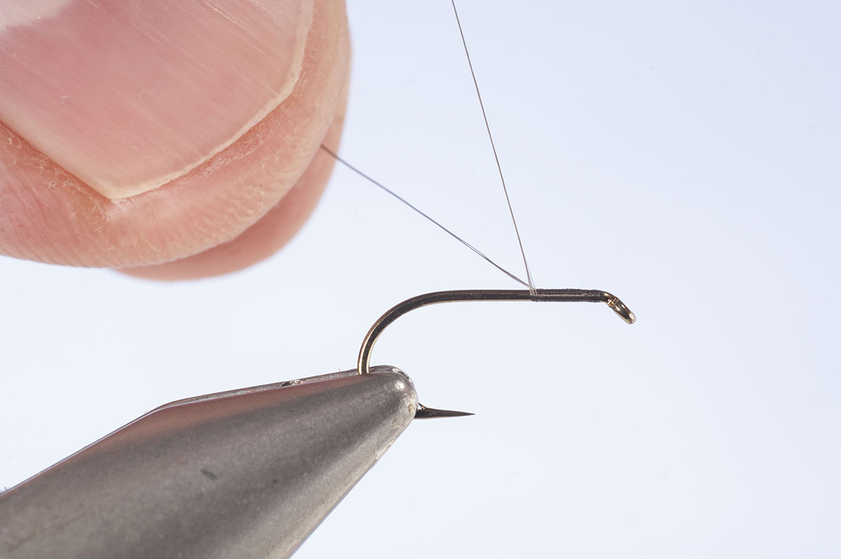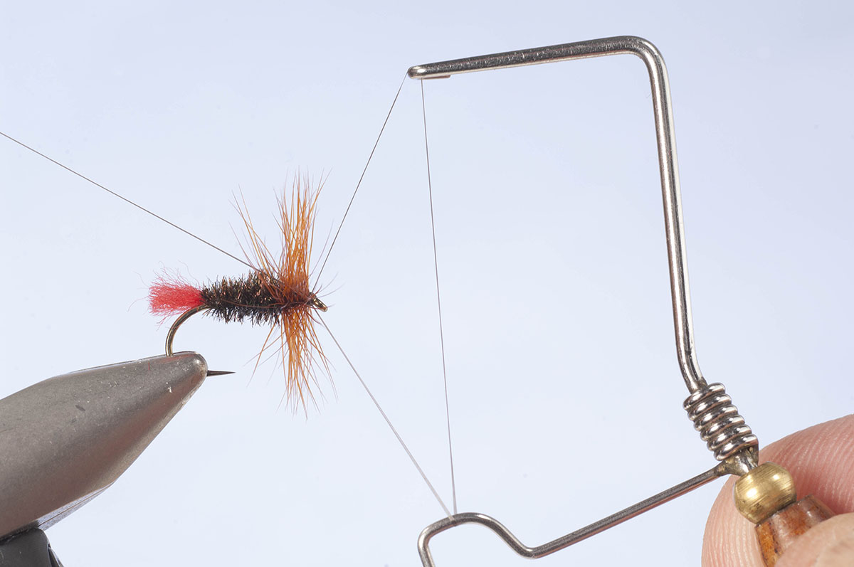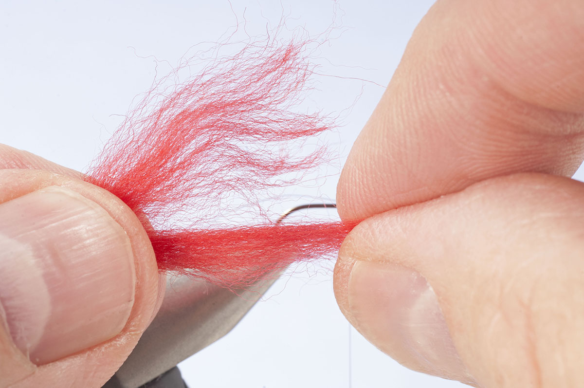 Mit drei Wicklungen die Fibern am Punkt wo der Tag anfängt fixieren und den Bindefaden, zur Verbesserung der Festigkeit, über die Fibern nach vorne wickeln. Den Faden bis hinter das Hakenöhr bringen. Den Überstand der Fibern abschneiden.