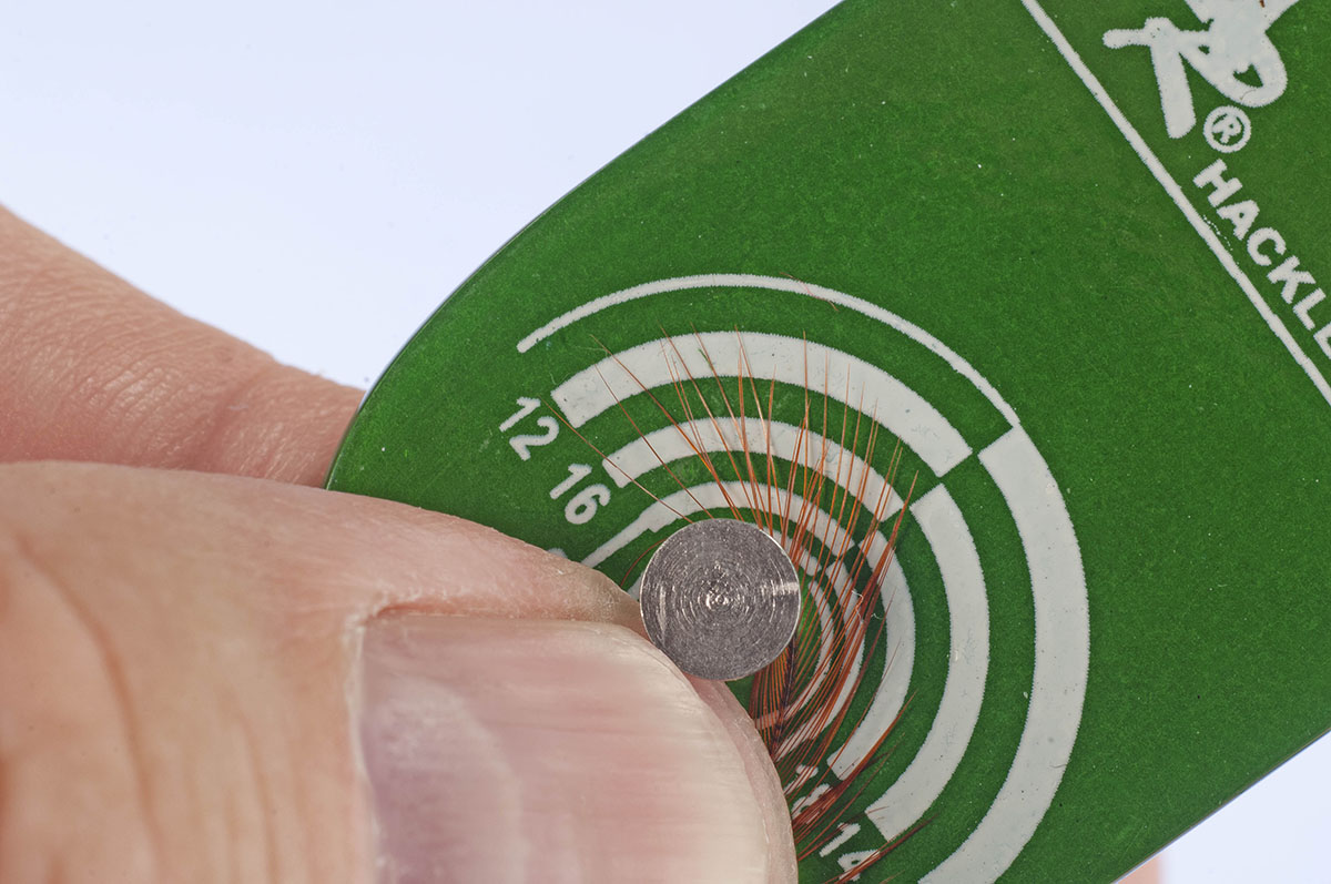 Die weichen, flaumigen Fibern an der Unterseite entfernen und die Hechel mit der hohlen, matten Seite nach vorne einbinden.