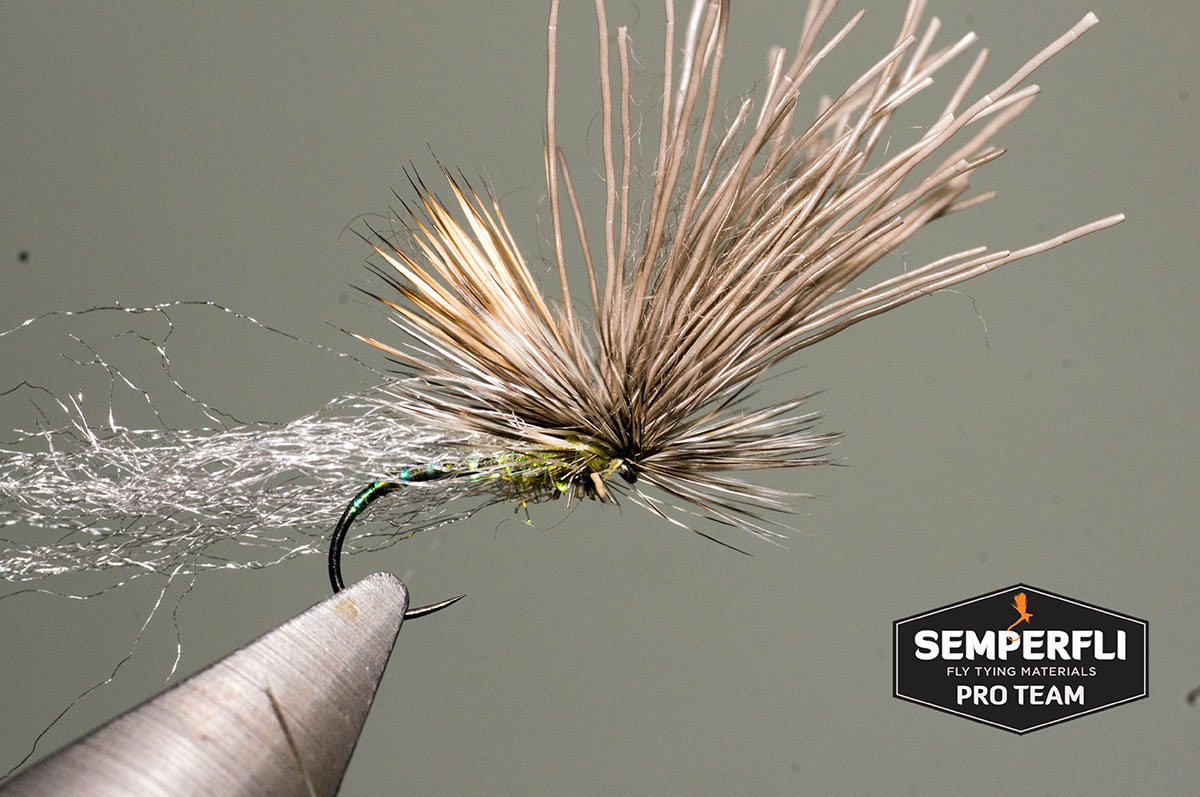 Schritt 7. Nachdem das Elchhaar aufrecht gestellt wurde, die Hechel im Parachutestil um das Elchhaar wickeln und fixieren. Anschließend einen Abschlussknoten machen.