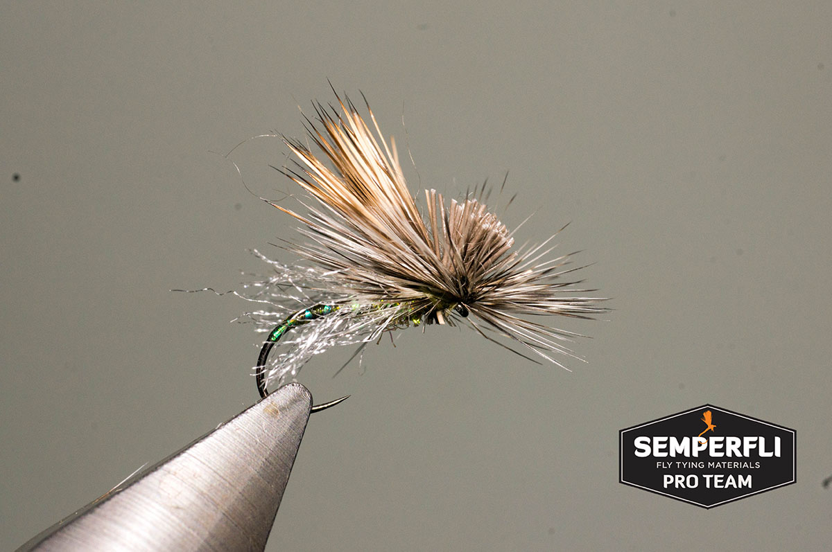 Schritt 8. Hechel stutzen und das Elchhaar abschneiden, wie man es von einer Elk Hair Caddis gewohnt ist. Das Antron straff ziehen und abschneiden (Länge auch hier in etwas bis Anfang des Hakenbogens).
