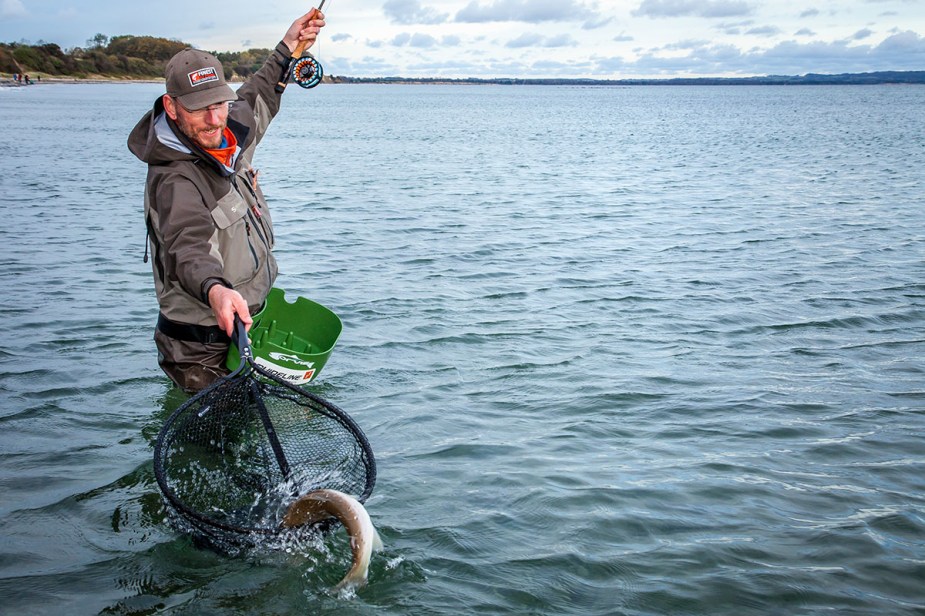 Das Glück ist mit uns. Am morgen hat zwar der Wind nicht nachgelassen (im Laufe des Tages zieht der Wind auf Stärke 6-7 an), aber das Wasser bei Brunhoved ist wieder klarer geworden und wir legen schnell los. Ich tue mich schwer mit dem Wind, der sich erneut gedreht hat und wieder aus westlicher Richtung kommt. Direkt auf die Wurfhand und somit muss ich mich zum Ufer drehen und quasi meine Backcasts schießen lassen um meine Schnur ohne großen Verletzungsrisiken auf Länge zu bringen. Klappt nicht immer, aber ich schaffe doch die meisten Würfe dahin zu bekommen wo ich möchte. Am Ende des Vorfachs hängt eine Brenda – na klar – und ich staune nicht schlecht, als nach einer guten halben Stunde ein vehementer Anbiß kommt. Ich spüre direkt, dass es ein guter Fisch ist. Trotz einiger Fluchten, bekomme ich schnell die Überhand und kann nach knapp 5 Minuten den Fisch in den Kescher gleiten lassen.