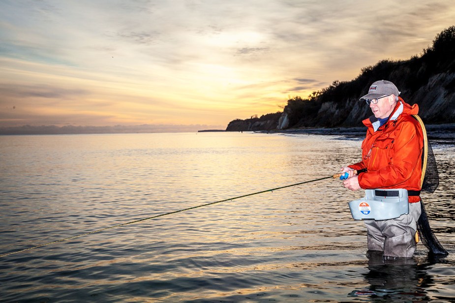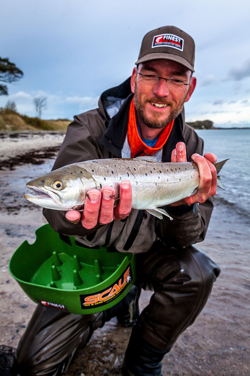 Wir sind an diesem Morgen nicht die einzigen, die sich Ålebaek Strand ausgesucht haben. Einige Kollegen stehen schon im Wasser und versuchen mit „Blech“ ihr Glück. Der Wind kommt ziemlich straff von der linken Seite. Direkt vor Ålebaek Strand ist zudem im Uferbereich das Wasser aufgrund des starken Windes etwas eingetrübt. Wir beschließen in östlicher Richtung zu laufen, in Richtung Brunhoved. Hinter der Spitze ist es für uns in der Tat bequemer, na ja, für mich als Linkshänder nicht wirklich, aber das Wasser ist weniger eingetrübt und somit stehen erste Versuche nichts im Wege. Rudy hat schon schnell Fischkontakt und die ersten Bilder sind im Kasten. Auch ich spüre kurz vor der Mittagspause einen Ruck in die Rute, aber der Fisch packt nicht richtig zu. Komischerweise folgt der Anbiss relativ nah am Ufer, auf ca. 15 Meter, wo Rudy seine Anbisse wesentlich weiter draußen bekommt. Unsere Muster sind relativ identisch, wir fischen beide eine kleinere Magnus, Rudy in Naturfarben, ich mit einer Lila-Hechel. Nach der Mittagspause gehe ich noch mal zurück zur Stelle, wo ich den Anbiss bekam. Beim 2. Wurf an ziemlich genau der gleichen Stelle, wird meine Fliege wieder genommen und diesmal hängt die Meerforelle. Kurzer Drill, kleinerer Fisch und weiter geht es. Für mich war es das dann aber auch.