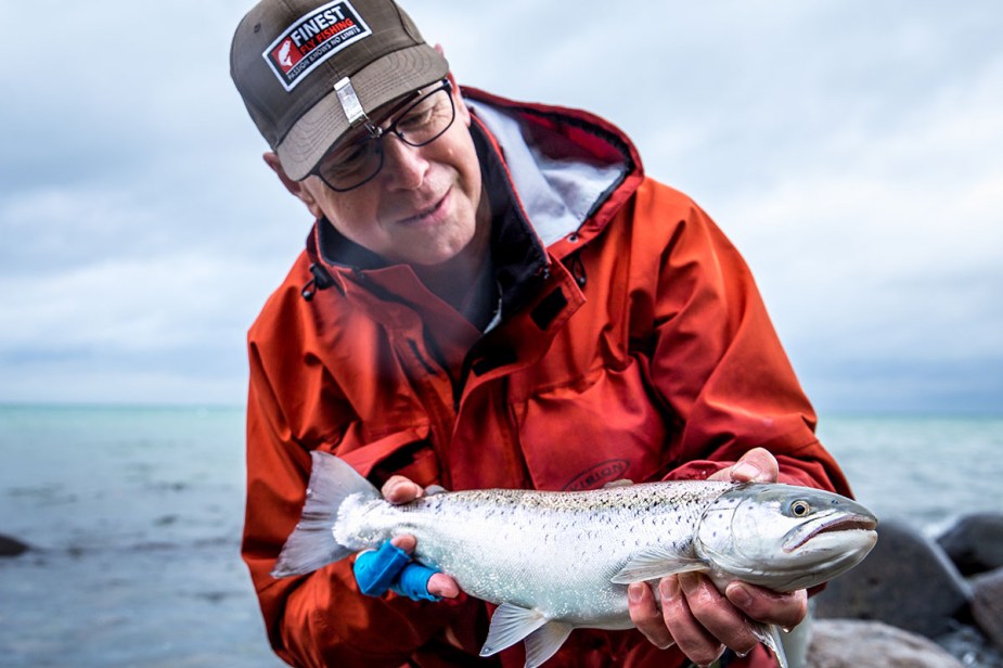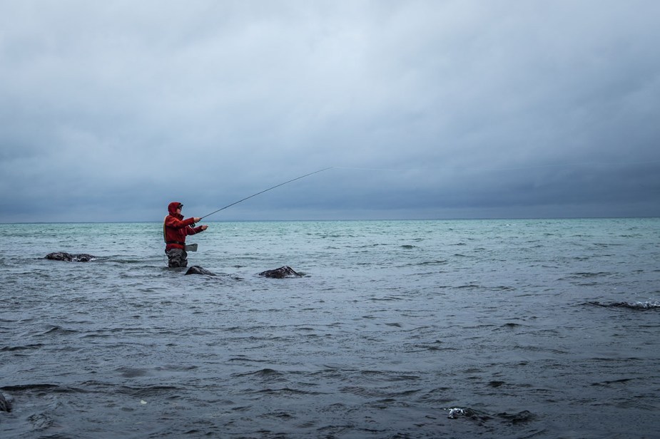 Ich beschließe mein Setup zu ändern. Der 8 Fuß lange Polyleader „Hover“ wird gewechselt und ein 10 Fuß „Slow Sinking“ kommt ans Ende der Schnur. Rudy scheint den gleichen Gedanken zu haben und wechselt ebenfalls. Er entscheidet sich für eine schnellsinkende Variante (jedoch an einer Schwimmschnur). Das „mehr“ an Länge und auch ein wenig mehr Gewicht, erleichtern das Werfen und ich komme wieder dahin wo ich will. Rudy ist der Erste, der vom Wechsel profitiert und kann einen Fisch landen. Dann ist Theos‘ Rute krumm. Er scheint einen richtigen Brocken am Haken zu haben. Aber das Glück ist nicht auf seiner Seite. Der Fisch zeigt sich 2 – 3 Mal. Dann ist es vorbei. Unglücklich gehakt, so scheint es, als hätte der Fisch mit den Zähnen die Schnur durchgeschnitten.