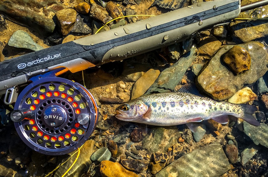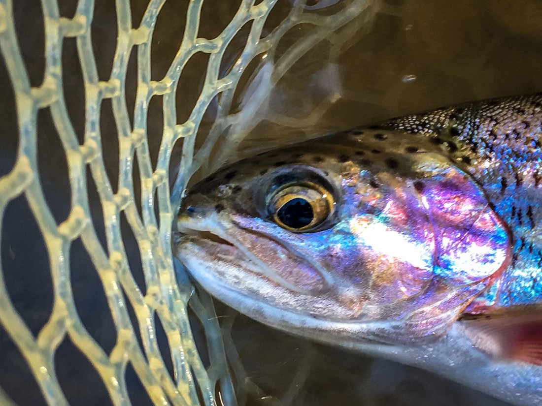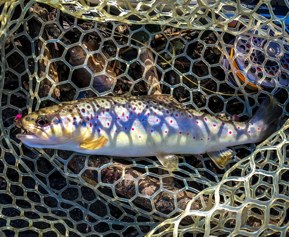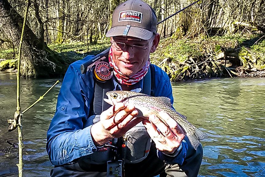 Nachdem mehrere Muster zum Einsatz kamen (man muss erst mal suchen), brachte eine Hasenohrnymphe mit pinkem Tungsten Bead die erhofften Fische. Mir persönlich ist es ziemlich egal, wie groß die Fische sind. An meinem Hausgewässer, ein eher kleiner Bach, sind die Fische generell keine Riesen. Ein Ü30er ist schon ein guter Fang. Und so freute ich mich über kleinere Regenbogenforellen und mittzwanziger Bachforellen ebenso, als über eine knappe 30er, die mir richtig Spaß an der 3er Rute machte.