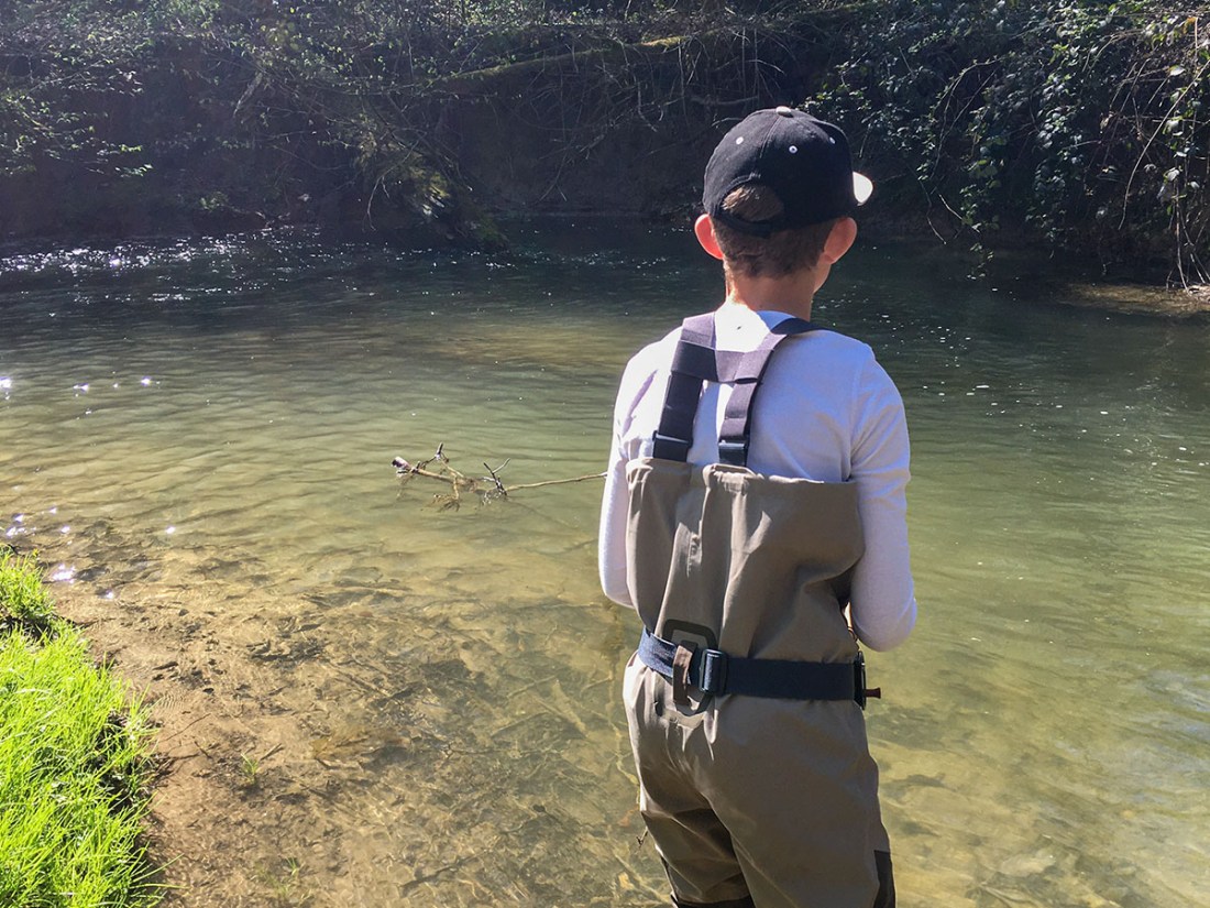 Nun muss Papa – leider – auch einige Gänge zurück schalten. Laden zu, Kinder zuhause, Partner ebenfalls im Home Office, ein gute Planung ist gefragt, aber es bleibt auch etwas mehr Zeit. „Na klar, können wir Angeln gehen.“ Da es für die beiden Jungs schon ein wenig länger her ist, kommt der Practicaster aus dem Schrank und wird im Garten fleißig geübt. Die Schnüre werden präpariert, die Fliegendosen auf Vordermann gebracht. Kann los gehen! Die Fahrt zum Wasser, ein Genuss. Endlich mal Zeit in Ruhe zu quatschen…