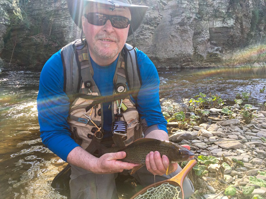 Die nächsten 2 Würfe bringen 2 weitere Fische. Wie toll ist das denn?! Weiter stromauf kann auch Robert einige Forellen verhaften. Es wird ein rundum gelungener Tag. Bach- und Regenbogenforellen an Nymphe und Streamer, ein starker Döbel ist auch noch mit dabei. Der Höhepunkt ist eine tolle Äsche für Robert, die wir vor der Kamera schnell festhalten und beim zurücksetzen noch in bewegten Bildern festhalten. Gemeinsame Freude ist doppelte Freude und man weiß die gemeinsame Zeit am Wasser um zu mehr zu schätzen. Und es lenkt für einen Tag mal ab von den aktuellen Herausforderungen, die es zu bewältigen gibt.