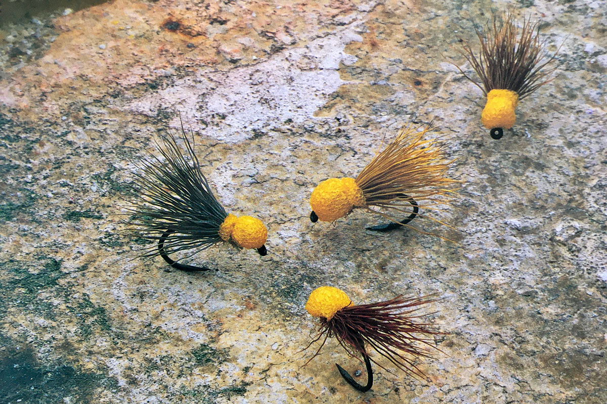 Die Balloon Caddis ist eine Nachahmung einer Sedge, die sich direkt an der Wasseroberfläche ihrer Haut am Ende des Puppenstadium entledigt. Um das Profil so realistisch wie möglich zu gestalten, wird, anstelle einer Hechel, ein schwimmendes Schaumstoffmaterial verwendet, um die Fliege über Wasser zu halten. Der gelbe Thorax aus Schaumstoff hilft nicht nur dabei die Fliege schwebend zu halten, sondern bildet auch einen Buckel, der dem der aufsteigenden, erwachsenen Sedge sehr ähnlich ist. Ein tödliches Muster für Forelle und Äsche in dem Stadium, wenn das Insekt am Anfälligsten ist.