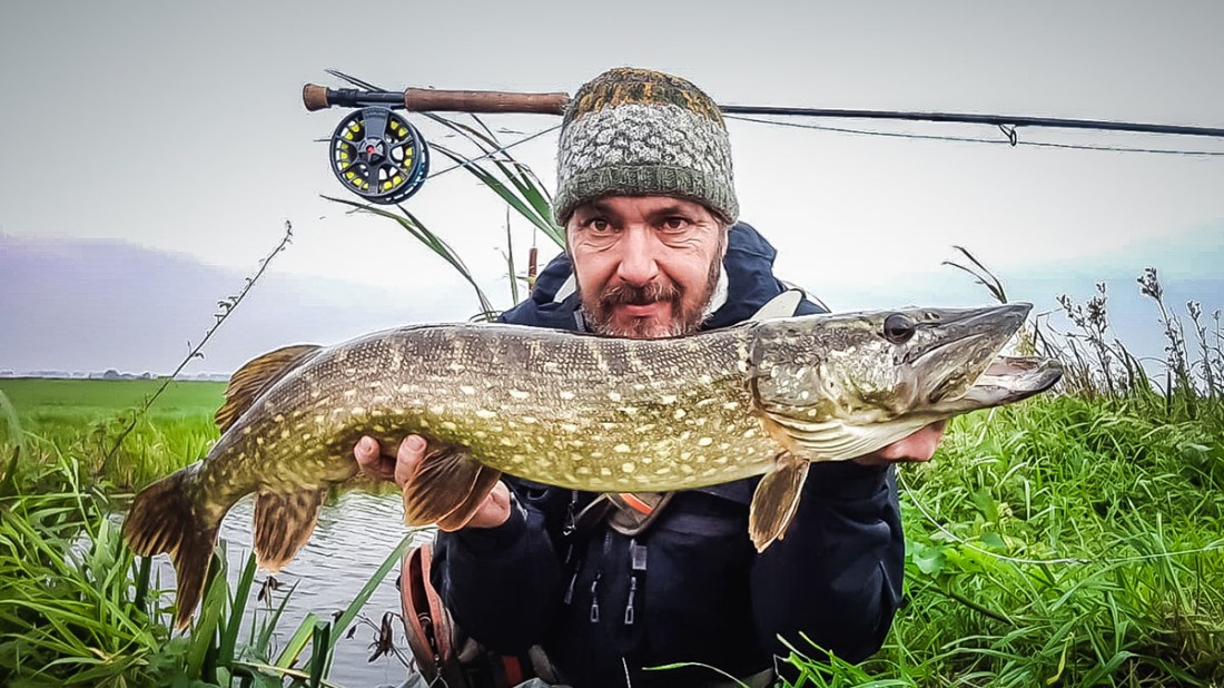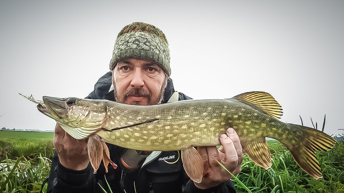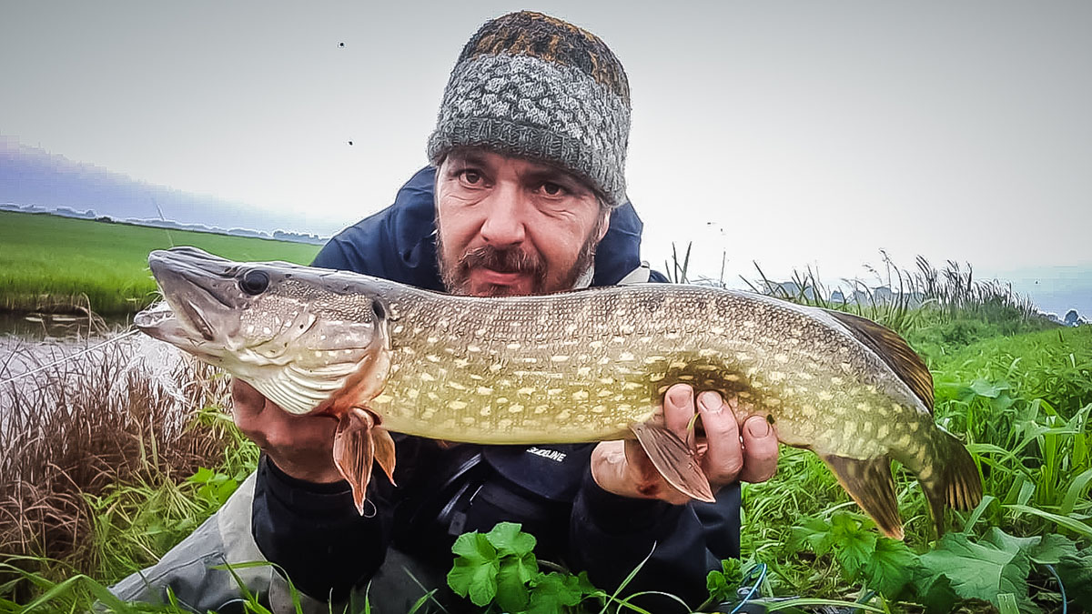 Ich fische an dieser Wetering (Wetterung/Graben) nun in der anderen Richtung und schon schnell macht es Bums in der Rute. Dieser Hecht hat sich richtig schön in den Ahrex Haken festgebissen und bietet ordentlich paroli. Nach eine tollen Kampf kommt der Hecht jedoch in Reichweite. Während des Hechtangelns, trage ich immer eine Wathose. Somit kann ich mich schnell ins Wasser gleiten lassen und den Hecht per Kiemengriff mit der Hand landen. Ein schöner Fisch, den ich schnell ablichte, bevor er wieder schwimmen darf.